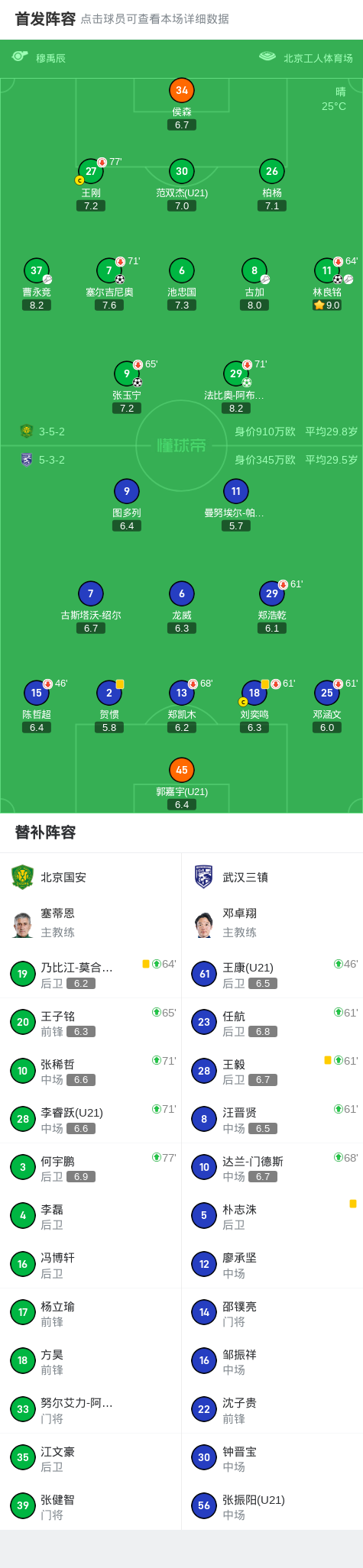 北京时间8月25日20:00,中超联赛第22轮,北京国安主场迎战武汉三镇。上半场,张玉宁头球攻门错失良机,帕拉西奥斯长途奔袭射门打偏,法比奥造点并亲自操刀命中,随后塞尔吉尼奥扩大领先;下半场,林良铭传射建功,张玉宁进球后伤退。最终北京国安4-0武汉三镇,取得一场酣畅淋漓的胜利。